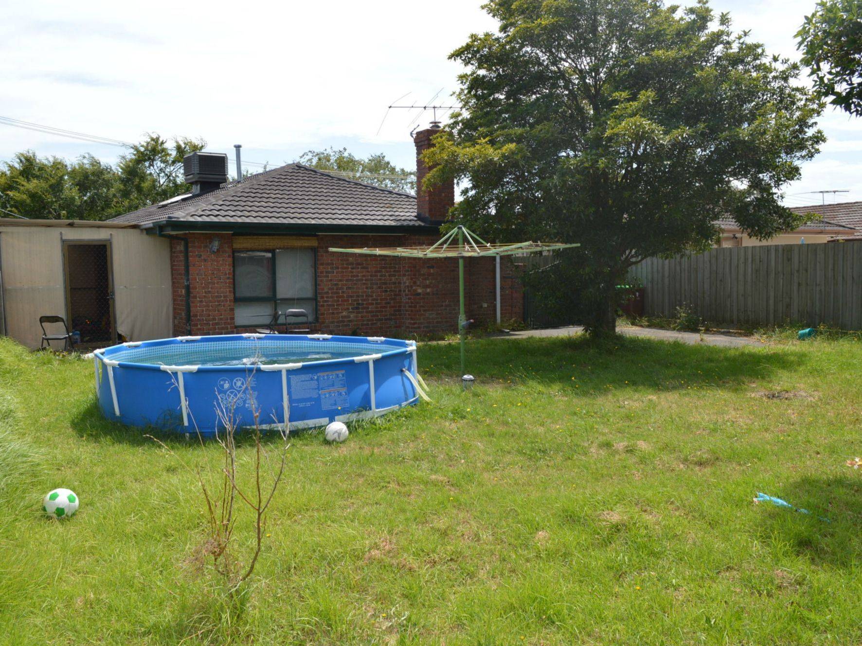 The backyard is large with plenty of space for kids to play.