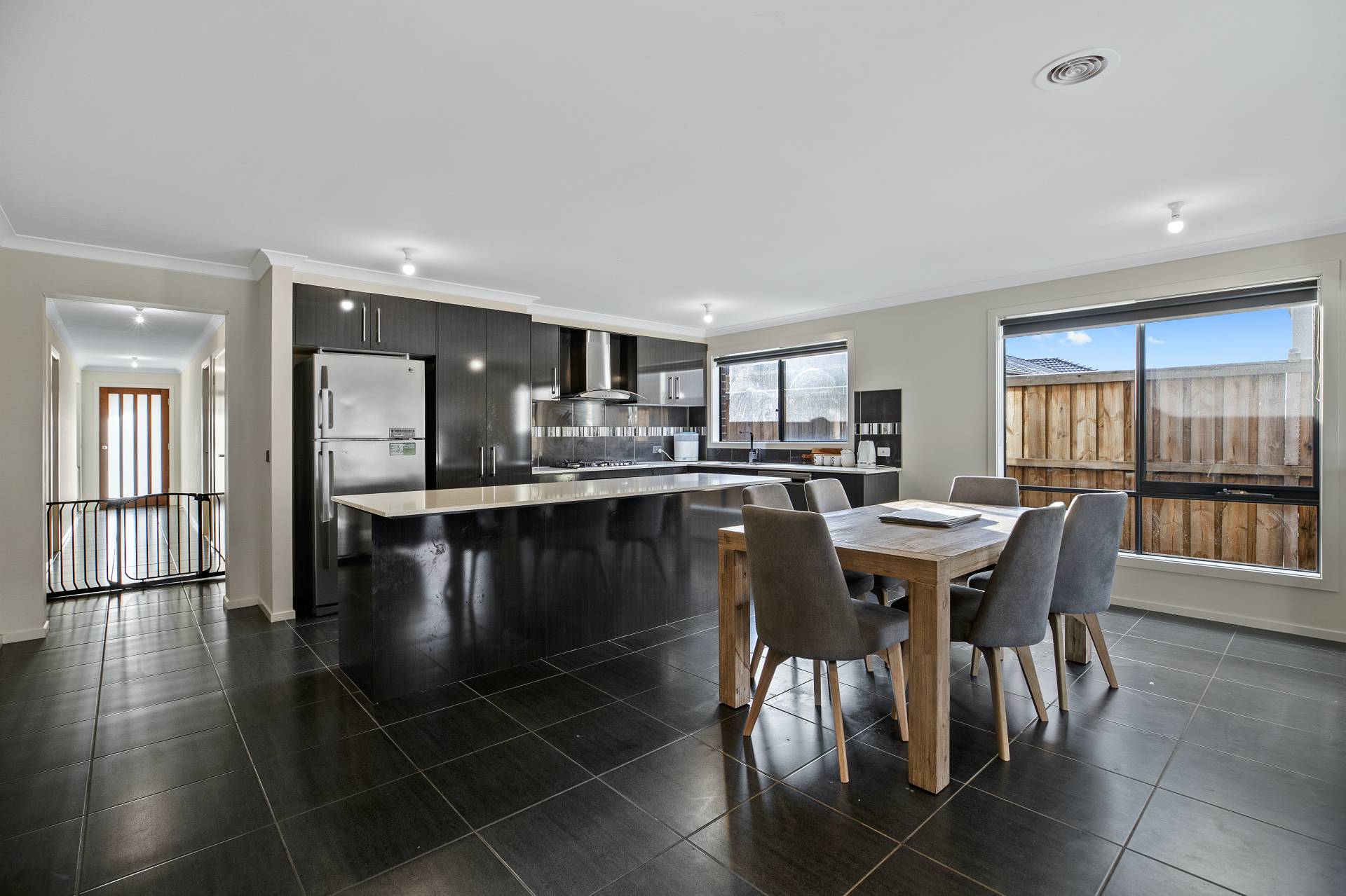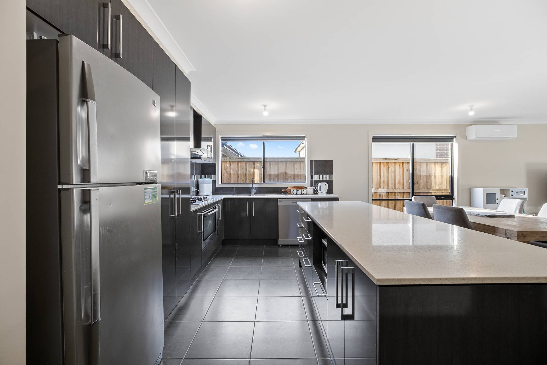 - Modern kitchen overlooking the tiled meals and living zone