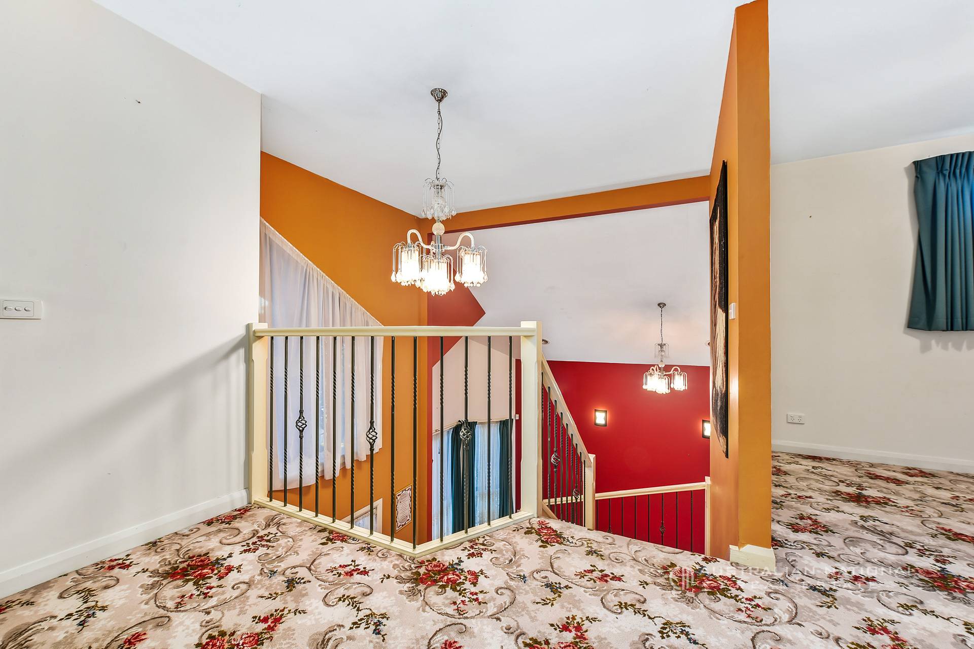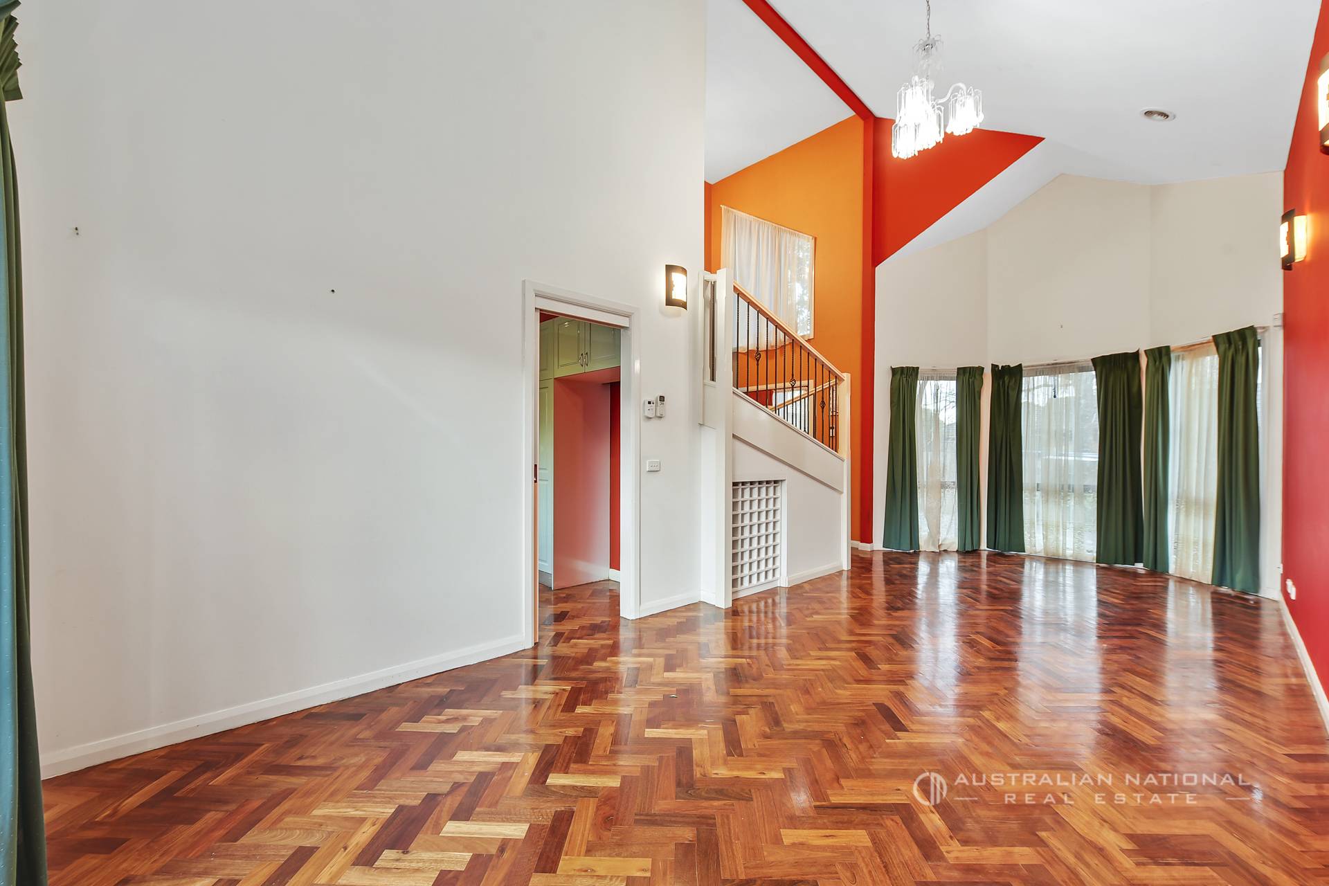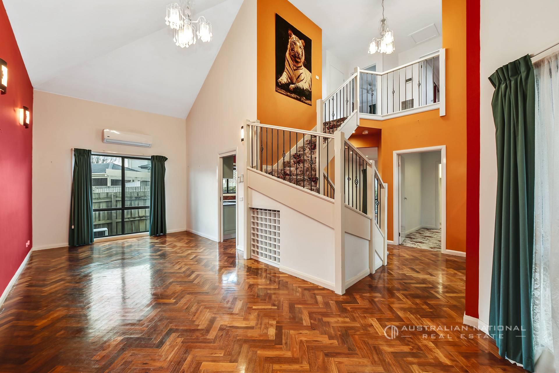 Behind the striking contemporary facade, leafy landscaping, you’ll discover a grand entry with beautiful parquet flooring, a sweeping wrought-iron staircase, vibrant feature walls, and high cathedral ceilings.