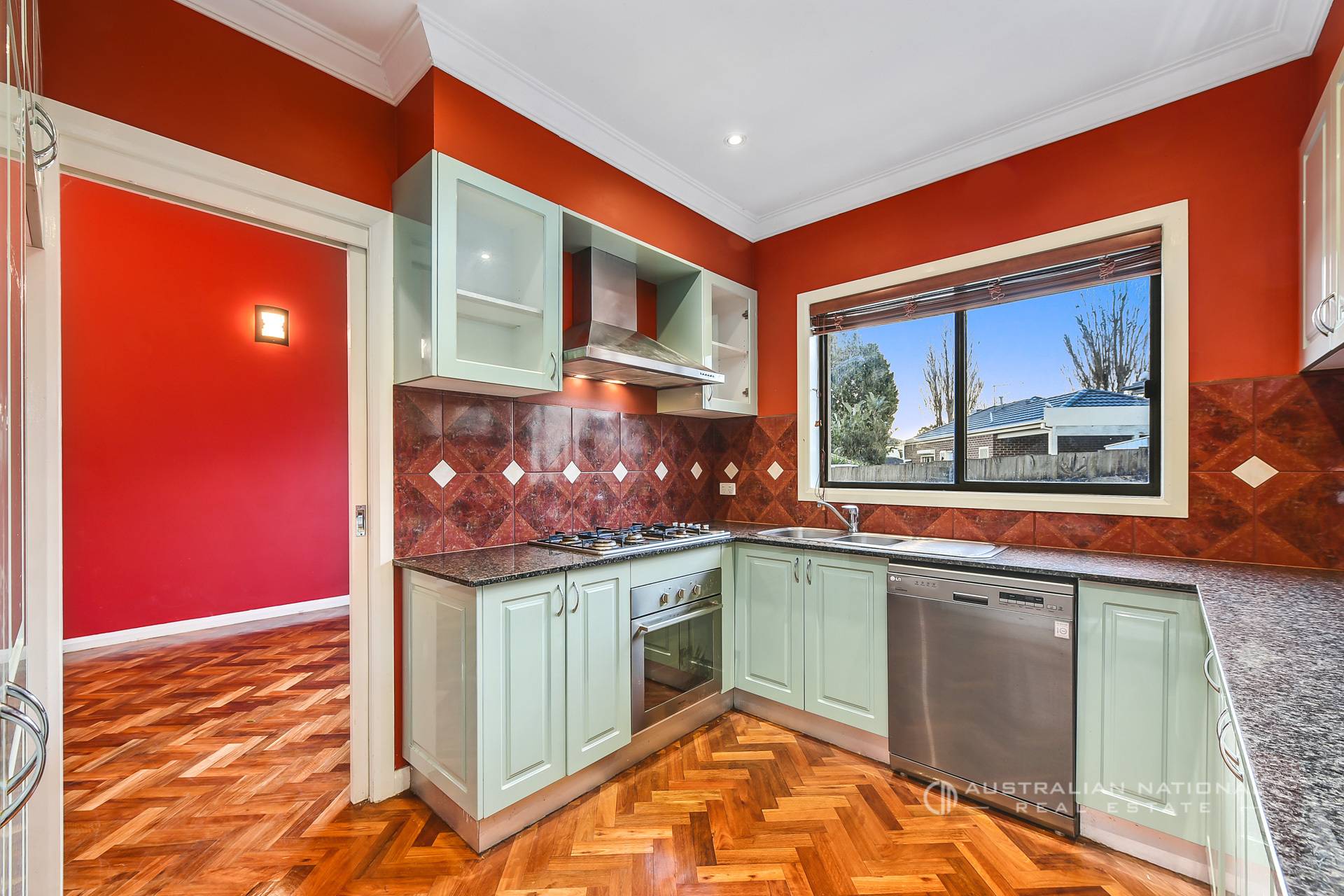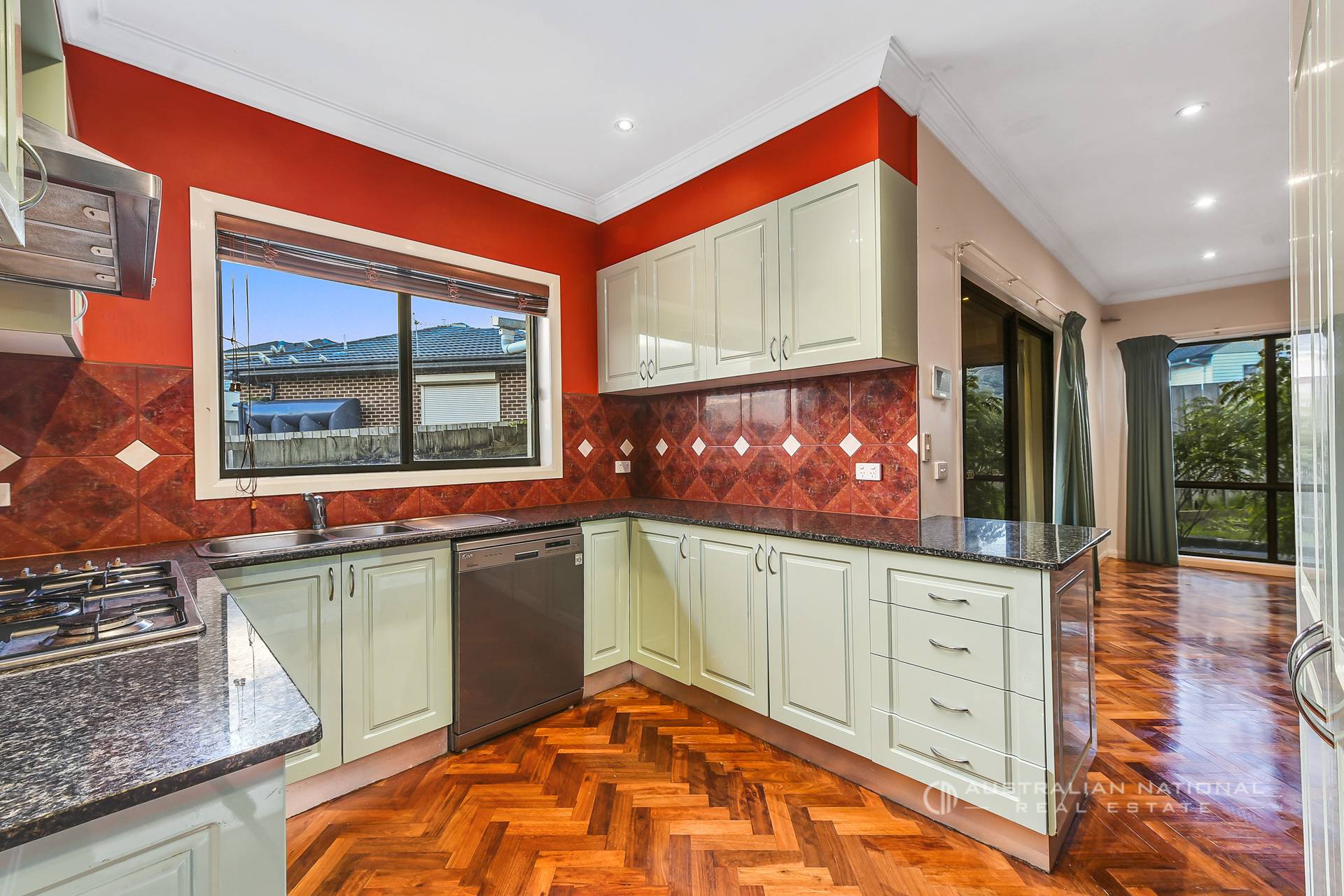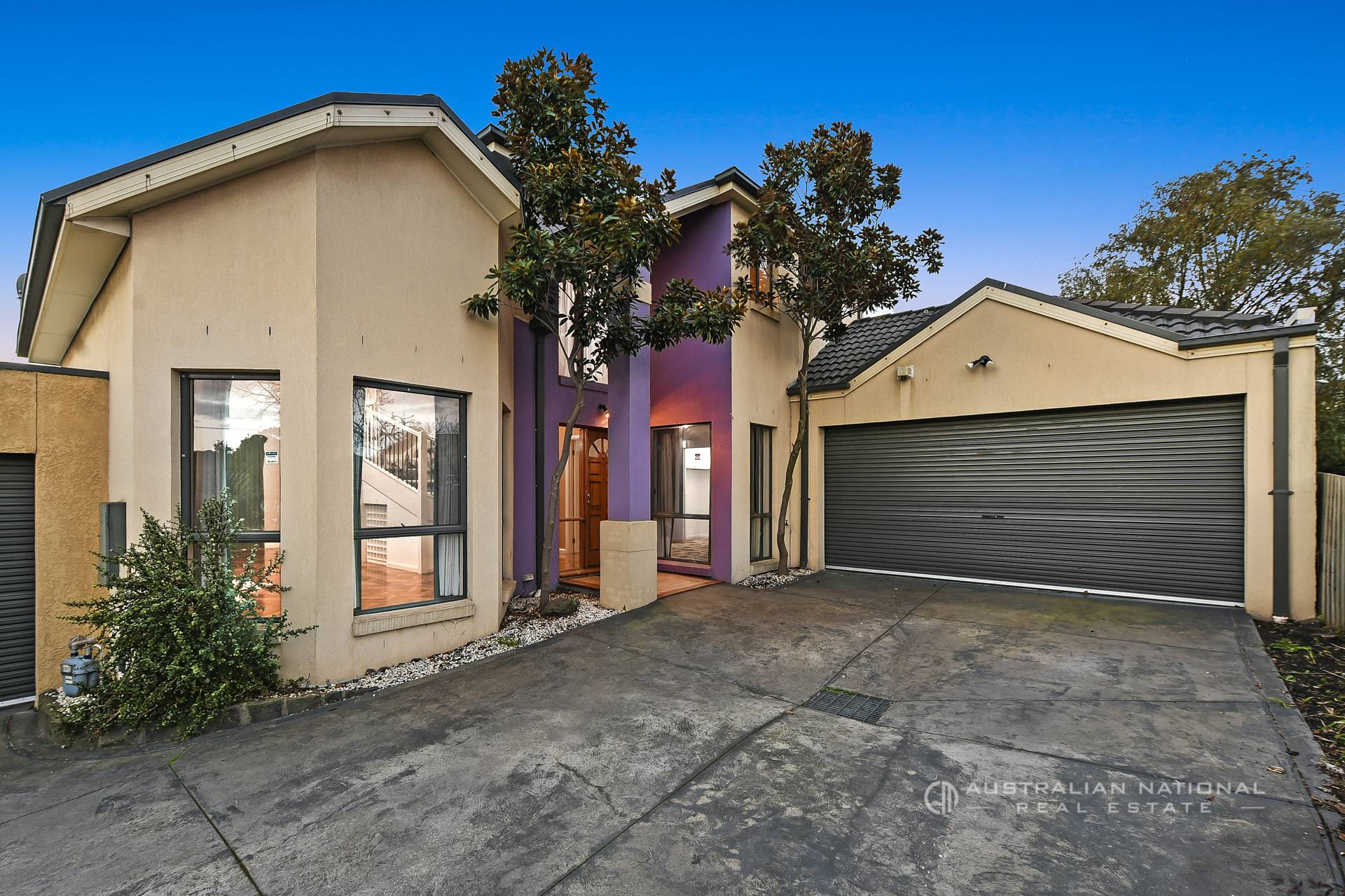 Behind the striking contemporary facade, leafy landscaping, you’ll discover a grand entry with beautiful parquet flooring, a sweeping wrought-iron staircase, vibrant feature walls, and high cathedral ceilings.